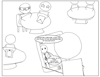 The Stick Figure Consortium is a cross-instutitonal collaboration between students at the University of Utah (Englis 5950/Writing 5905) and the University of Wisconsin-Madison (English 236). The courses were taught by Casey Boyle and Jim Brown in Spring 2014. Public Eyes was creating during a six-week period, and it was authored and drawn entirely by students. The Consortium used Comic Life software for layout and lettering.